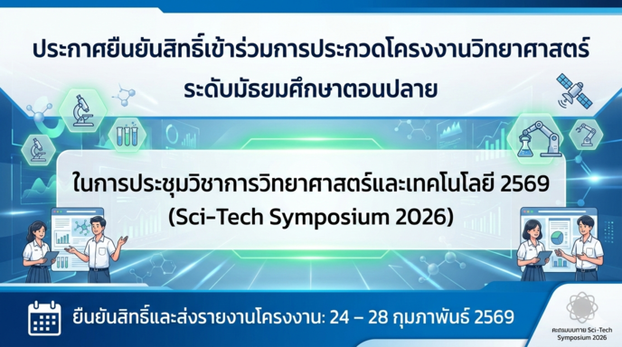 ประกาศยืนยันสิทธิ์เข้าร่วมการประกวดโครงงานวิทยาศาสตร์ ระดับมัธยมศึกษาตอนปลาย ในการประชุมวิชาการวิทยาศาสตร์และเทคโนโลยี 2569
