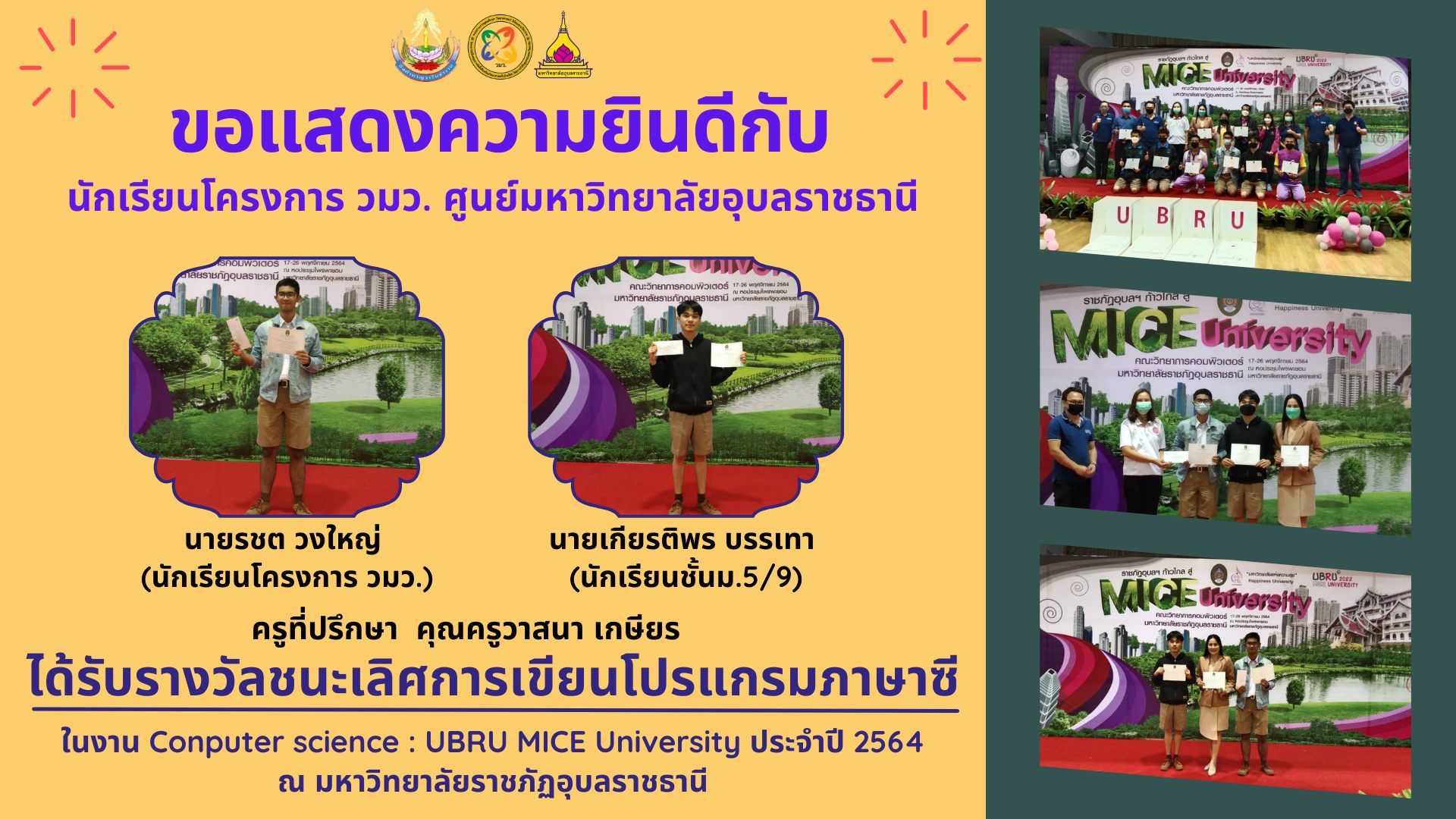 | นักเรียนโครงการ วมว. คู่ศูนย์มหาวิทยาลัยอุบลราชธานี คว้ารางวัลชนะเลิศในงาน Conputer science : UBRU MICE University ประจำปี 2564 ณ มหาวิทยาลัยราชภัฏอุบลราชธานี |